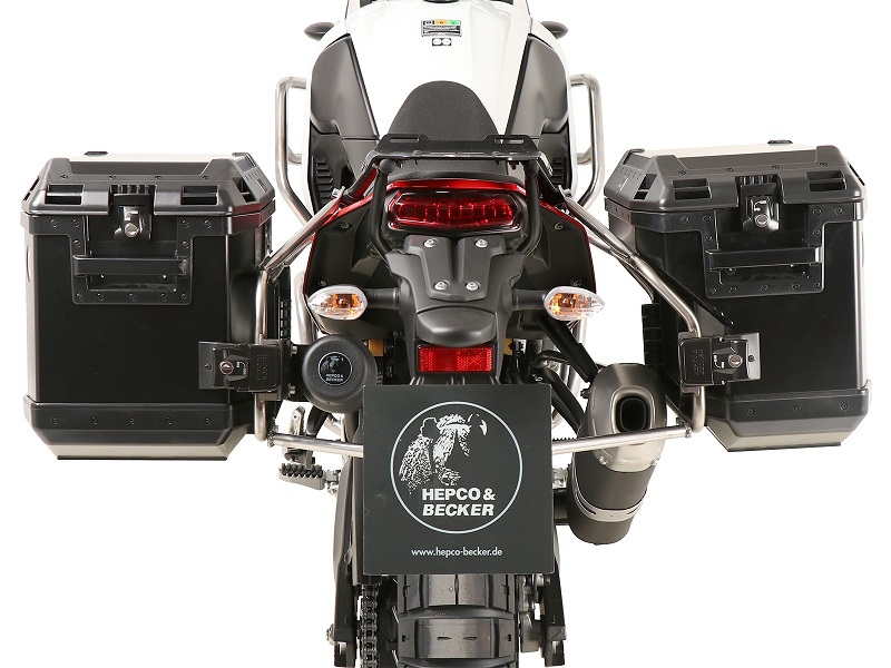 Complete zijkofferset van het kwaliteitsmerk Hepco&Becker, bestaand uit een RVS kofferrek en een set Xplorer zijkoffers (37/40 liter).